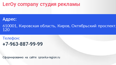 LerOy company, студия рекламы по адресу 610001, Кировская область, Киров, Октябрьский проспект, 120 в дальнейшем Организация, размещена в следующих категориях: