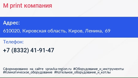 M-print, компания по адресу 610020, Кировская область, Киров, Ленина, 69 в дальнейшем Организация, размещена в следующих категориях: