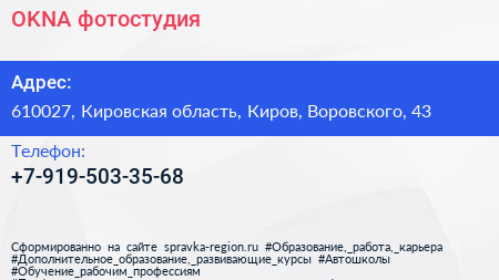 OKNA, фотостудия по адресу 610027, Кировская область, Киров, Воровского, 43 в дальнейшем Организация, размещена в следующих категориях: