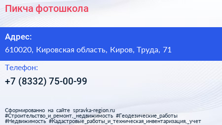Пикча, фотошкола по адресу 610020, Кировская область, Киров, Труда, 71 в дальнейшем Организация, размещена в следующих категориях:
