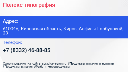 Полекс, типография по адресу 610046, Кировская область, Киров, Анфисы Горбуновой, 23 в дальнейшем Организация, размещена в следующих категориях: