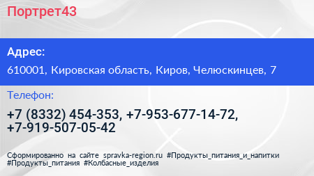 Портрет43 по адресу 610001, Кировская область, Киров, Челюскинцев, 7 в дальнейшем Организация, размещена в следующих категориях:
