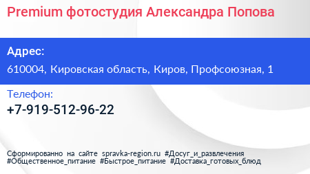 Premium, фотостудия Александра Попова по адресу 610004, Кировская область, Киров, Профсоюзная, 1 в дальнейшем Организация, размещена в следующих категориях: