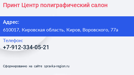 Принт-Центр, полиграфический салон по адресу 610017, Кировская область, Киров, Воровского, 77а в дальнейшем Организация, размещена в следующих категориях: