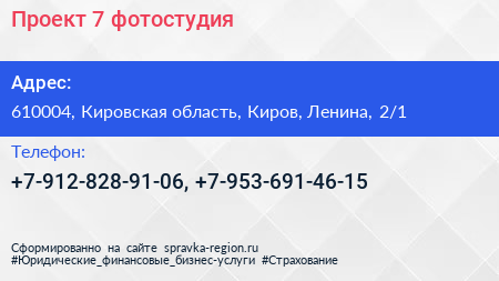 Проект №7, фотостудия по адресу 610004, Кировская область, Киров, Ленина, 2/1 в дальнейшем Организация, размещена в следующих категориях: