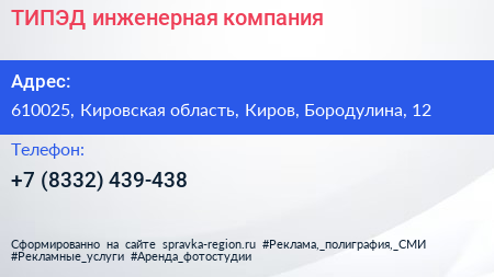 ТИПЭД, инженерная компания по адресу 610025, Кировская область, Киров, Бородулина, 12 в дальнейшем Организация, размещена в следующих категориях: