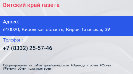 Вятский край, газета по адресу 610020, Кировская область, Киров, Спасская, 39 в дальнейшем Организация, размещена в следующих категориях: