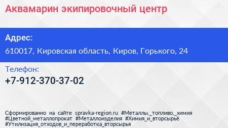 Аквамарин, экипировочный центр по адресу 610017, Кировская область, Киров, Горького, 24 в дальнейшем Организация, размещена в следующих категориях: