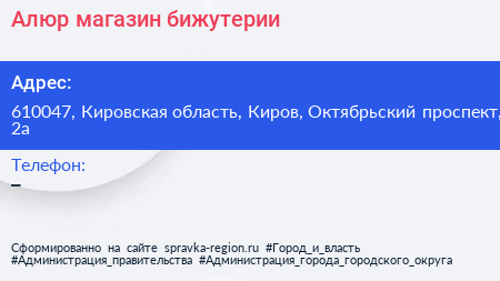 Алюр, магазин бижутерии по адресу 610047, Кировская область, Киров, Октябрьский проспект, 2а в дальнейшем Организация, размещена в следующих категориях:
