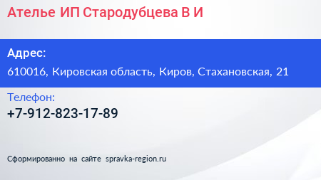 Ателье, ИП Стародубцева В.И. по адресу 610016, Кировская область, Киров, Стахановская, 21 в дальнейшем Организация, размещена в следующих категориях: