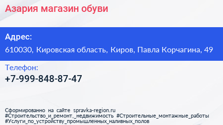 Азария, магазин обуви по адресу 610030, Кировская область, Киров, Павла Корчагина, 49 в дальнейшем Организация, размещена в следующих категориях:
