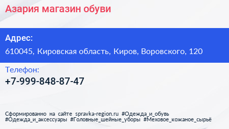 Азария, магазин обуви по адресу 610045, Кировская область, Киров, Воровского, 120 в дальнейшем Организация, размещена в следующих категориях: