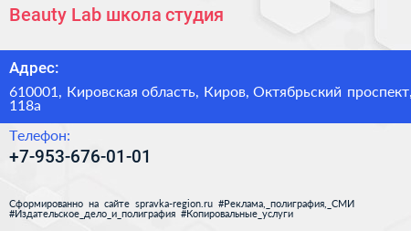 Beauty Lab, школа-студия по адресу 610001, Кировская область, Киров, Октябрьский проспект, 118а в дальнейшем Организация, размещена в следующих категориях: