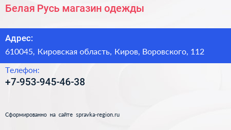 Белая Русь, магазин одежды по адресу 610045, Кировская область, Киров, Воровского, 112 в дальнейшем Организация, размещена в следующих категориях: