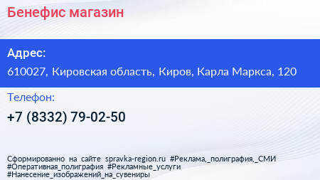 Бенефис, магазин по адресу 610027, Кировская область, Киров, Карла Маркса, 120 в дальнейшем Организация, размещена в следующих категориях: