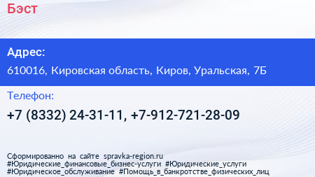 Бэст по адресу 610016, Кировская область, Киров, Уральская, 7Б в дальнейшем Организация, размещена в следующих категориях:
