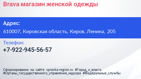 Brava, магазин женской одежды по адресу 610007, Кировская область, Киров, Ленина, 205 в дальнейшем Организация, размещена в следующих категориях: