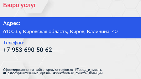 Бюро услуг по адресу 610035, Кировская область, Киров, Калинина, 40 в дальнейшем Организация, размещена в следующих категориях: