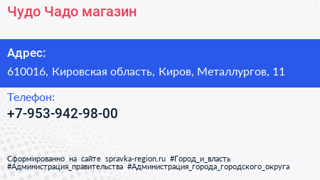 Чудо-Чадо, магазин по адресу 610016, Кировская область, Киров, Металлургов, 11 в дальнейшем Организация, размещена в следующих категориях: