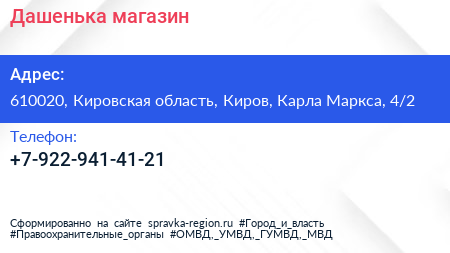 Дашенька, магазин по адресу 610020, Кировская область, Киров, Карла Маркса, 4/2 в дальнейшем Организация, размещена в следующих категориях: