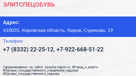 ЭЛИТСПЕЦОБУВЬ по адресу 610035, Кировская область, Киров, Сурикова, 19 в дальнейшем Организация, размещена в следующих категориях: