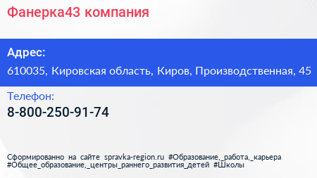 Фанерка43, компания по адресу 610035, Кировская область, Киров, Производственная, 45 в дальнейшем Организация, размещена в следующих категориях: