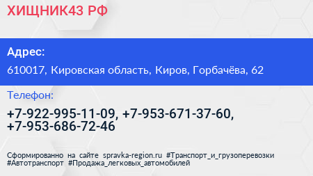 ХИЩНИК43.РФ по адресу 610017, Кировская область, Киров, Горбачёва, 62 в дальнейшем Организация, размещена в следующих категориях: