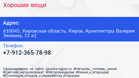 Хорошие вещи по адресу 610045, Кировская область, Киров, Архитектора Валерия Зянкина, 11 к1 в дальнейшем Организация, размещена в следующих категориях: