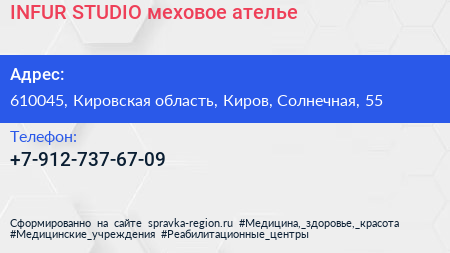 INFUR. STUDIO, меховое ателье по адресу 610045, Кировская область, Киров, Солнечная, 55 в дальнейшем Организация, размещена в следующих категориях: