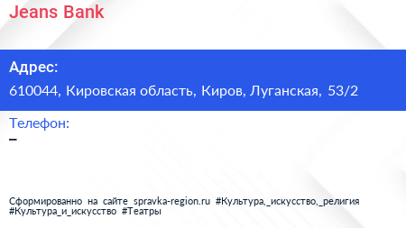 Jeans Bank по адресу 610044, Кировская область, Киров, Луганская, 53/2 в дальнейшем Организация, размещена в следующих категориях: