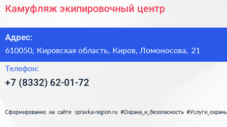 Камуфляж, экипировочный центр по адресу 610050, Кировская область, Киров, Ломоносова, 21 в дальнейшем Организация, размещена в следующих категориях: