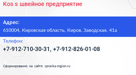 Kos`s, швейное предприятие по адресу 610004, Кировская область, Киров, Заводская, 41а в дальнейшем Организация, размещена в следующих категориях: