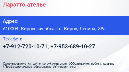 Ларэтто, ателье по адресу 610004, Кировская область, Киров, Ленина, 39а в дальнейшем Организация, размещена в следующих категориях: