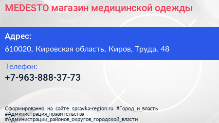 MEDESTO, магазин медицинской одежды по адресу 610020, Кировская область, Киров, Труда, 48 в дальнейшем Организация, размещена в следующих категориях: