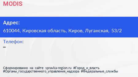 MODIS по адресу 610044, Кировская область, Киров, Луганская, 53/2 в дальнейшем Организация, размещена в следующих категориях: