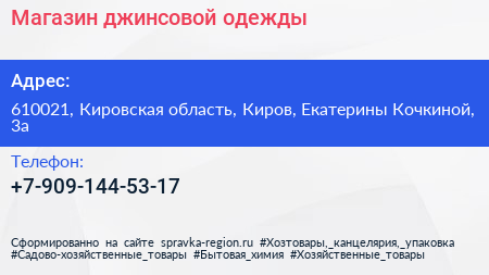 Магазин джинсовой одежды по адресу 610021, Кировская область, Киров, Екатерины Кочкиной, 3а в дальнейшем Организация, размещена в следующих категориях: