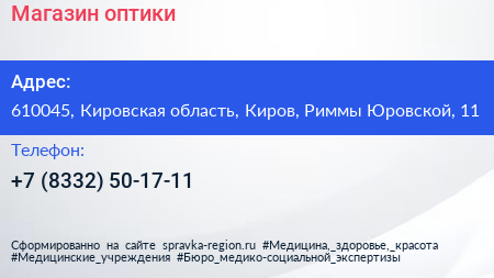 Магазин оптики по адресу 610045, Кировская область, Киров, Риммы Юровской, 11 в дальнейшем Организация, размещена в следующих категориях: