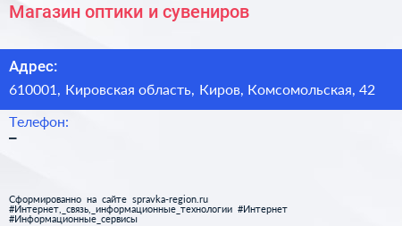 Магазин оптики и сувениров по адресу 610001, Кировская область, Киров, Комсомольская, 42 в дальнейшем Организация, размещена в следующих категориях: