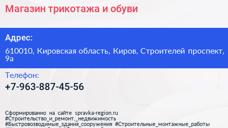 Магазин трикотажа и обуви по адресу 610010, Кировская область, Киров, Строителей проспект, 9а в дальнейшем Организация, размещена в следующих категориях: