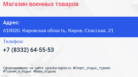 Магазин военных товаров по адресу 610020, Кировская область, Киров, Спасская, 21 в дальнейшем Организация, размещена в следующих категориях: