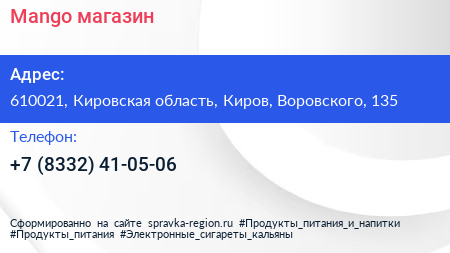Mango, магазин по адресу 610021, Кировская область, Киров, Воровского, 135 в дальнейшем Организация, размещена в следующих категориях: