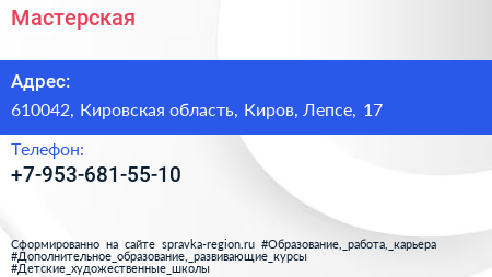 Мастерская по адресу 610042, Кировская область, Киров, Лепсе, 17 в дальнейшем Организация, размещена в следующих категориях: