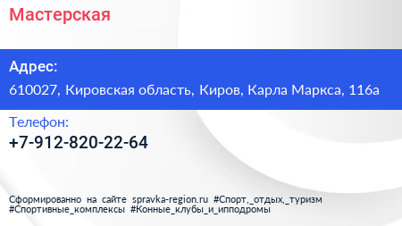 Мастерская по адресу 610027, Кировская область, Киров, Карла Маркса, 116а в дальнейшем Организация, размещена в следующих категориях: