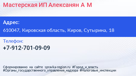 Мастерская, ИП Алексанян А.М. по адресу 610047, Кировская область, Киров, Сутырина, 18 в дальнейшем Организация, размещена в следующих категориях: