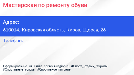 Мастерская по ремонту обуви по адресу 610014, Кировская область, Киров, Щорса, 26 в дальнейшем Организация, размещена в следующих категориях: