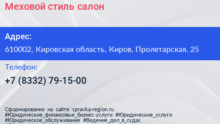 Меховой стиль, салон по адресу 610002, Кировская область, Киров, Пролетарская, 25 в дальнейшем Организация, размещена в следующих категориях: