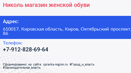 Николь, магазин женской обуви по адресу 610017, Кировская область, Киров, Октябрьский проспект, 86 в дальнейшем Организация, размещена в следующих категориях: