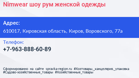 Nimwear, шоу-рум женской одежды по адресу 610017, Кировская область, Киров, Воровского, 77а в дальнейшем Организация, размещена в следующих категориях: