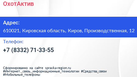 ОхотАктив по адресу 610021, Кировская область, Киров, Производственная, 12 в дальнейшем Организация, размещена в следующих категориях: