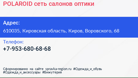 POLAROID, сеть салонов оптики по адресу 610035, Кировская область, Киров, Воровского, 68 в дальнейшем Организация, размещена в следующих категориях:
